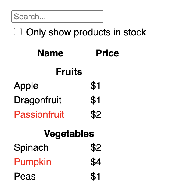 3. 어디에 state가 존재해야 할지 정해봅시다: 우리는FilterableProductTable에 검색어와 체크 박스 값을 state로 둘 겁니다.